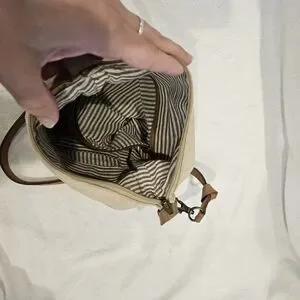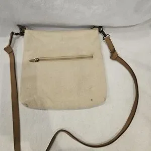 Charming crossbody bag with a bird print. Features a tan strap.