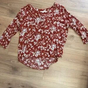 Charming floral blouse with a relaxed fit. Features a rust background with white floral pattern. Perfect for casual outings.