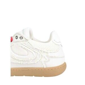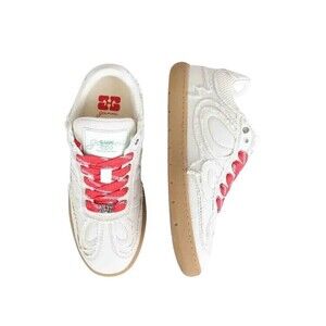 Ganni sneakers embody a unique fusion of sporty appeal and modern design, featuring a meticulously crafted white upper adorned with intricate stitched patterns. The vibrant red laces introduce a lively accent, harmonizing beautifully with a durable gum rubber sole. Crafted from an artful mix of materials including mesh and fabric, these sneakers are not only stylish but also sustainable, made with recycled polyester. Perfect for elevating casual and sporty looks alike, they exemplify a commitment to both fashion and the environment.