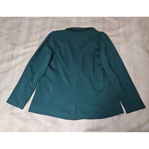 The product is a J. Jill women's green blazer in size M, designed for workwear and business occasions. This one-button blazer features a solid pattern, lined interior, and long sleeves. Made from a rayon/spandex blend material, the blazer has a regular fit and is suitable for all seasons. The classic style and single-breasted design make it a versatile addition to any wardrobe, perfect for adding a touch of sophistication to professional outfits. It is recommended to dry clean only to maintain its quality.