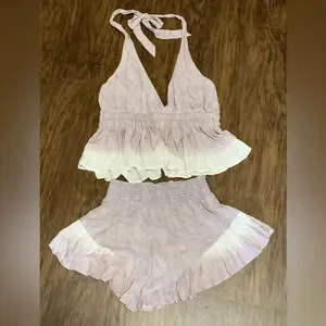 Size medium, very stretchy waist. Tie back top, new without the tags