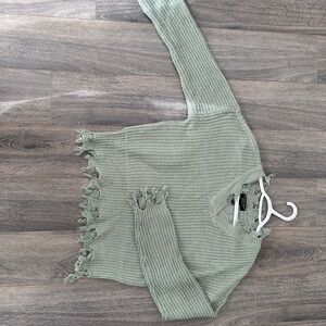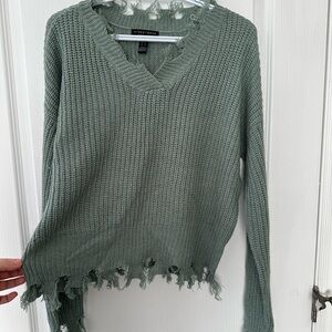 Chic sage green sweater with a V-neck design. Features stylish distressed details. Perfect for layering.