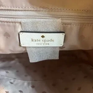 Zippered close at top with a gold-tone zipper. Beautiful fabric interior in a gold/taupe with a spades design throughout. Two drop pockets on one side, with a zippered pocket on the other. Signature Kate Spade emblem attached below the zippered pocket.