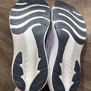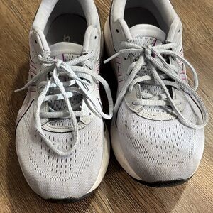 Light gray Asics sneakers with purple detailing. Ideal for running and workouts.