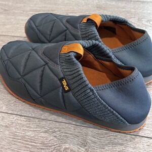 Teva ReEmber slip-on sneakers in a dark grey quilted ripstop with contrasting orange accents. These versatile outdoor slippers feature a collapsible heel for easy on-and-off wear, a ribbed knit collar, and a durable rubber outsole for traction. The interior is lined with a soft, warm material, making them ideal for camping, travel, or everyday comfort. Finished with a classic Teva logo tab and a triangular quilted pattern across the upper.