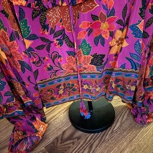 Vibrant blouse with floral patterns. Features ruffled neckline and long sleeves. Perfect for adding color to your outfit. This has a layer underneath and beaded tassels.