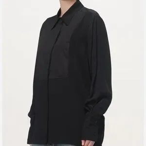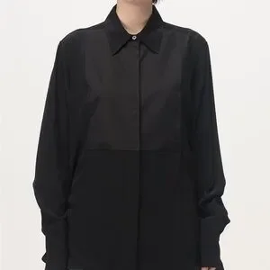 The Contrast Bib Shirt in Black by Victoria Beckham is a silk, tuxedo-inspired shirt featuring contrasting fabric front bib, and box pleat detail at the back.