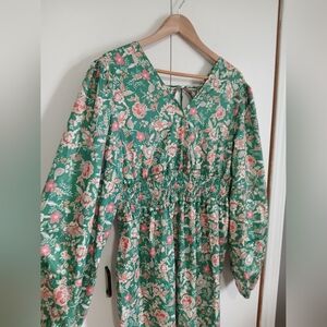 Moody Floral Green Long Sleeve Maxi Dress L/XL Smocked Waist Boho