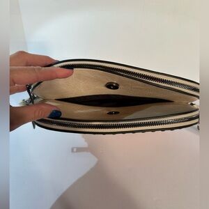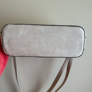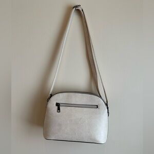 Cream colored features triple compartment interior. Two zipped close compartments and a snap closure middle. Zipped back pocket, adjustable and detachable strap. Faux leather exterior. Approximately 11” x 8”
