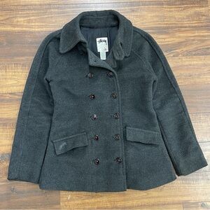 Elegant charcoal peacoat by Stussy. Features double-breasted design and classic lapels. Perfect for versatile styling.