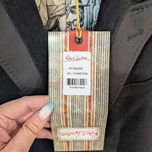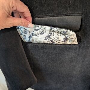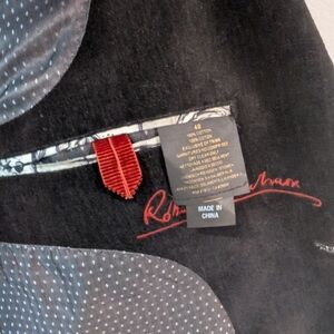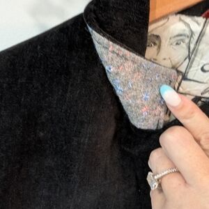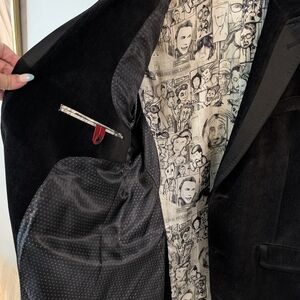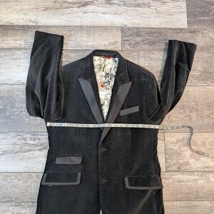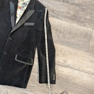 Elevate your wardrobe with the Robert Graham black velvet blazer, designed with a sophisticated notched lapel and luxurious texture. The contrasting trim adds a refined touch, making it an ideal choice for special occasions. Enjoy the unique interior lining that enhances its stylish appeal. size 40r. approximate flat measurements in photos. has tag. in like new pre-loved condition. d3