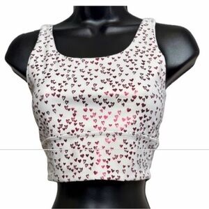 Adorable and sporty Define Your Inspiration cropped sports bra featuring an allover pink and red heart print on a white base.