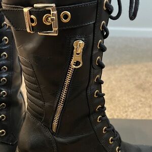 Step out in style with these chic black lace-up boots featuring elegant gold accents. Perfect for adding a bold touch to any outfit.