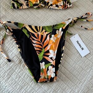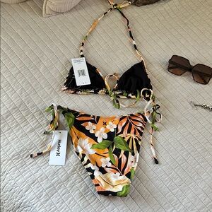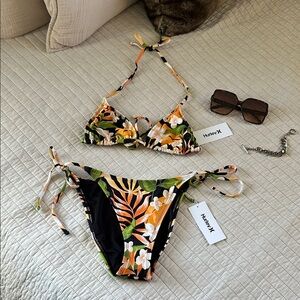 NWT Hurley black tropical floral triangle halter top tie side bikini set Large