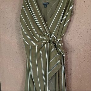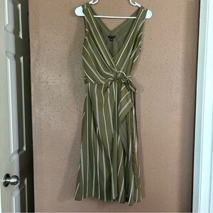 Women’s Ann Taylor sleeveless wrap dress in an olive green / army green color with white vertical pinstripes. Features a flattering V-neckline, adjustable side tie waist, and flowy midi length. Lightweight woven fabric with great drape. Perfect for workwear, office, business casual, or everyday chic looks
