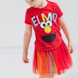 NWT sealed in bag. Beautiful bright Elmo tee with a colorful rainbow skirt. Includes a matching rainbow scrunchie. Size 24 Months.