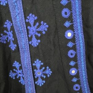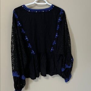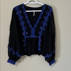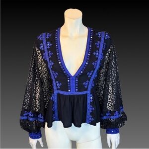 Free People Boogie All Night Embroidered Black and Blue Women's Top Lace Sleeves