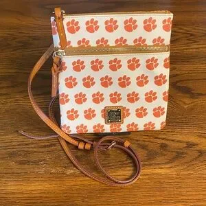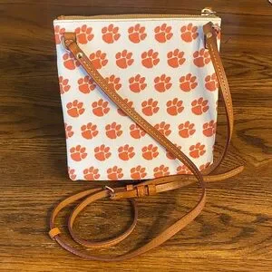 Chic crossbody with Clemson Tigers orange paw prints. White background. Two zipper pockets. Leather with leather zipper pulls & straps. Perfect for game day! Excellent homecoming gift.