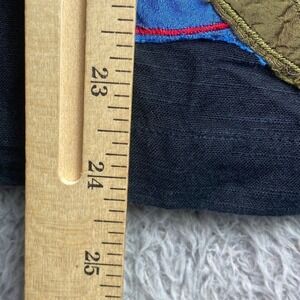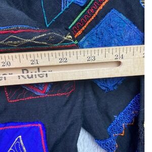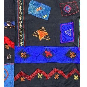 Chico's Design button-front shirt features an eclectic mix of vibrant embroidered geometric shapes, swirls, and patches against a solid black background. This artistic piece showcases intricate needlework and textured appliqués in shades of primary blue, red, yellow, and orange, creating a bold wearable art aesthetic. The lightweight fabric and relaxed silhouette make it a versatile layering piece or a standout statement top for those who appreciate unique, bohemian-inspired craftsmanship.