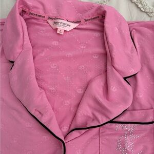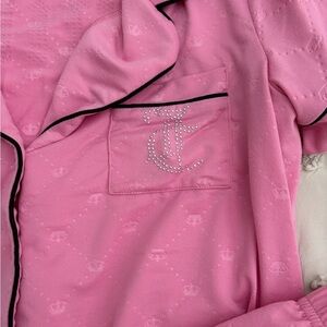 Chic pink pajama set with elegant piping. Features short sleeves and elastic waistband. Iconic Juicy Couture logo detail.