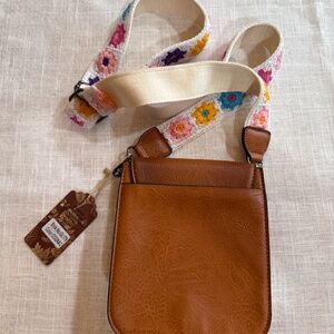 Cross body, stufdded brown whiskey color with crochet multi color flower strap, made of 100%vegan friendly material