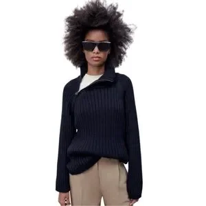 Zara navy blue 100% cotton ribbed mock neck sweater with a unique angled zip. Looks great with a contrasting tee, tank, or button up underneath. Oversized fit.
