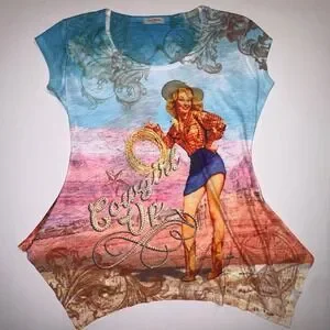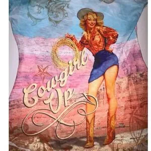 Keywords: graphic tee, pin up style, western, country, vintage inspired, desert scene, short sleeve, casual wear, themed party, quirky, bold print