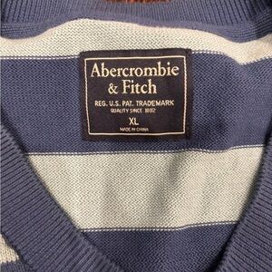 This Abercrombie & Fitch sweater for men is a V-neck pullover in a striped pattern of blue and mint colors. Made of 100% Pima cotton with a tight-knit fabric, it features long sleeves and a regular fit in size XL. The sweater is machine washable and has a logo accent on it. Suitable for casual occasions, it has a classic, preppy style with a USA theme, making it ideal for fall, winter, and spring seasons.