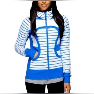 Lululemon Scuba ll Hoodie in a blue and white striped pattern. Fitted design featuring a full zip front, thumb holes and side pockets. Has ribbed paneling at sides and arms for ease of movement. Soft, thick cotton fleece fabric helps to retain heat. Fabric composition tag is missing.