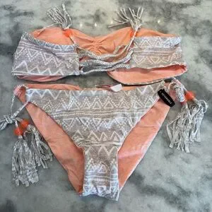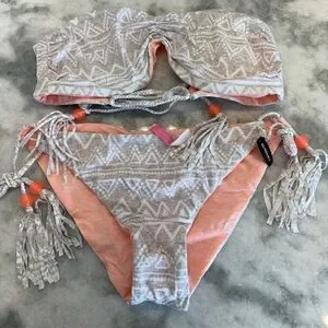 Stylish bikini with tribal patterns. Includes tassel details. Reversible bikini, insane Victoria’s Secret swim quality, tassels, beads, braided string.