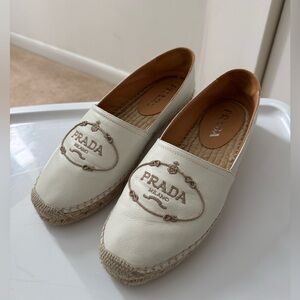 Chic cream slip-ons with signature Prada emblem. Ideal for relaxed style.
