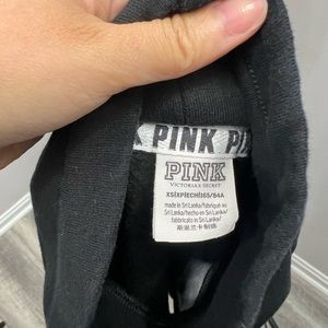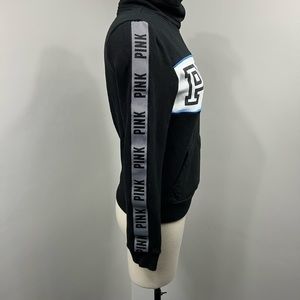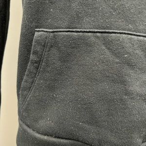 Size XS. Moderately worn with signs of wear along the material-shown in photos. Black white and blue colored material. Higher style turtle neckline. Drawstring has been removed. Front pocket detail. Print down the side of sleeves.