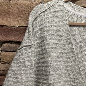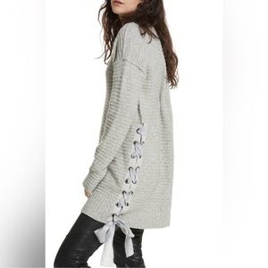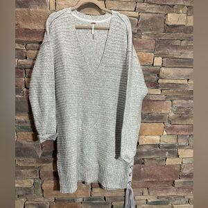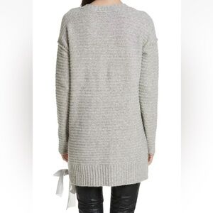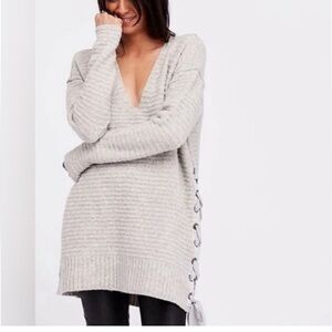 Cozy V-neck sweater. Ribbed texture. Side lace-up detail.