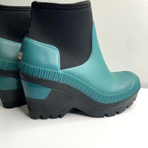 Hunter Original Deep Sea Wedge Bootie is a stylish ankle boot featuring a durable rubber construction and a comfortable neoprene upper for protection against wet conditions. Teal & black color block.Wedge heel size 3.75”, platform 1”. In good pre owned condition.