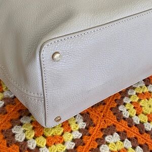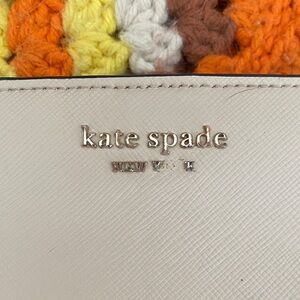 Stylish Kate Spade tote with a taupe body and black handles. Features a front zipper pocket for easy access. 2 inner pockets with 1 large zipper pocket.