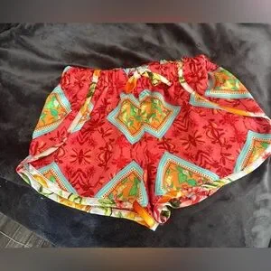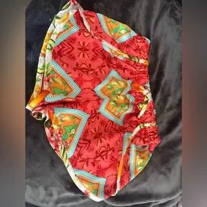 Bold oange fabric with intricate blue and green Hawaiian patterns. Eye-catching design.