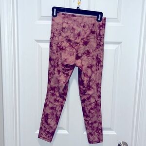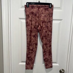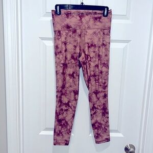 Athleta Salutation Stash Pocket 7/8 Printed Leggings. Tie dye, marbled, color is dark pink, maroon mauve color.