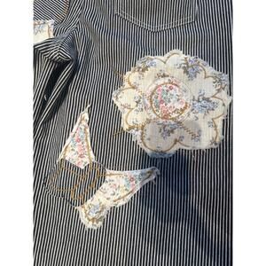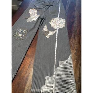 These wide-fit twill bottoms feature a structured silhouette with a relaxed drape. The design is highlighted by varied floral and butterfly patchwork, complemented by floral embroidered patches and accented pocket details for added texture. Finished with a crochet patchwork detail and a buckle back detail, the solid color base is softened by vintage washing, while an outseam detail adds subtle definition.