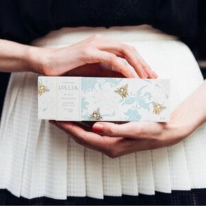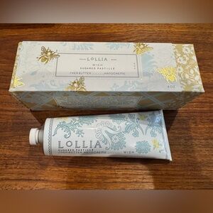 Lollia Wish Sugared Pastille Shea Butter Handcreme. Elegant packaging with gold accents.