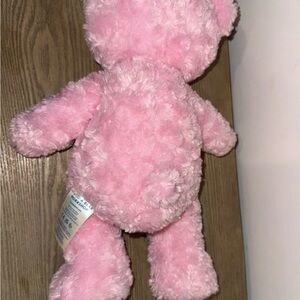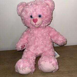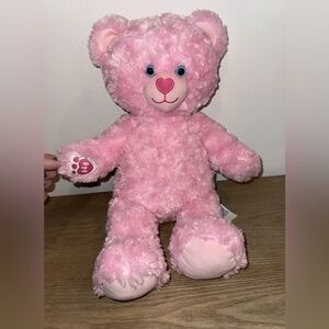 Build a Bear pink teddy bear. Adorable pink teddy bear plush toy perfect for kids. Soft and cuddly, this toy is a delightful companion for playtime and bedtime.