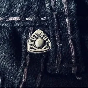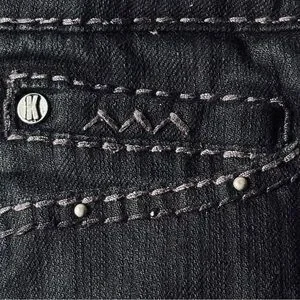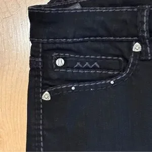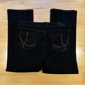 Classy dark black bootcut 5-pocket jeans featuring lots of subtle detail work including double top stitching on waistband, belt loops, pockets, back yoke, inseams, and hem. These jeans are absolutely stunning, with no wear or fading - like new!