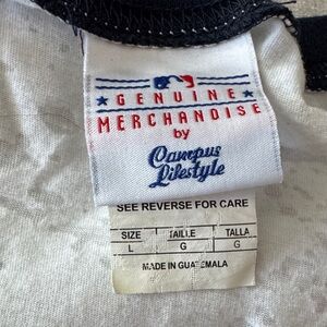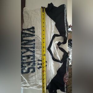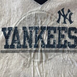 Stylish NY Yankees distressed V-neck shirt featuring a classic white and navy design. Perfect for fans to show their team spirit.