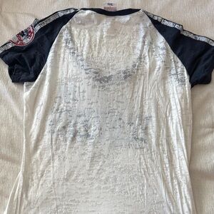NY Yankees Women’s V-Neck Distressed Shirt - White and Navy