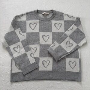 Cozy LOFT knit sweater featuring a soft gray and white gingham check pattern with adorable heart details throughout. Classic crew neckline with ribbed trim at the collar, cuffs, and hem. Lightweight but warm — perfect for layering in fall and winter.