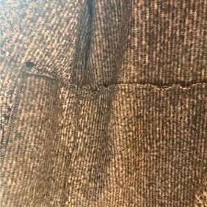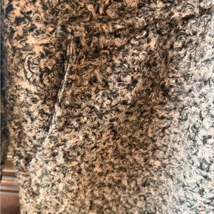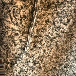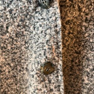 Warm and stylish hooded knit coat. Features a button-up front and side pockets. Perfect for chilly days. Made in Italy. Size Large. Roomy fit. Soft fabric. The colors of the yarn are black, gray, and a tan that looks pinkish in some lighting.