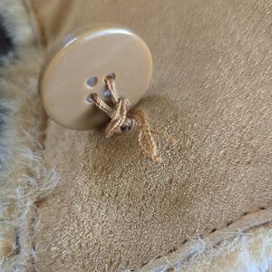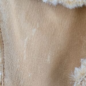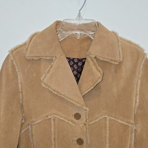 B. Lucid vintage stylish tan suede leather jacket with faux fur fringe trim details. Ideal for layering and enhancing your look. Please note, there are faint stains on the shoulders and the top button is loose, please see photos.