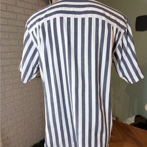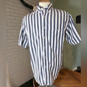 90s vintage Eddie Bauer short sleeve button-up in a soft bluish grey and white stripe. Classic spring / summer essential with that effortless coastal feel.