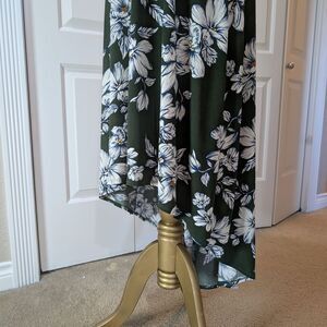 This chic floral faux wrap maxi dress features a stunning green and white pattern, v neck and high - low hem.