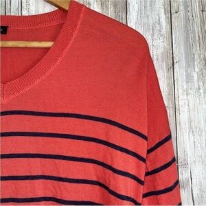 Elevate your style with this men's striped V-neck sweater. Featuring a vibrant coral color with classic black stripes, this sweater is perfect for any casual occasion. Enjoy comfort and style in one versatile piece.