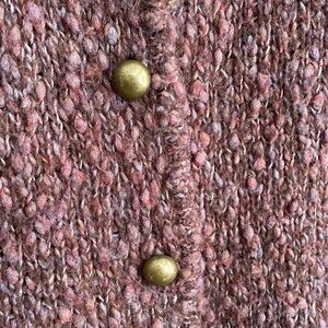 Cozy teddy jacket with button-up front. Rich plum burgundy hue. Ideal for layering. Size large. Featuring brass buttons in acrylic, nylon, wool blend.
